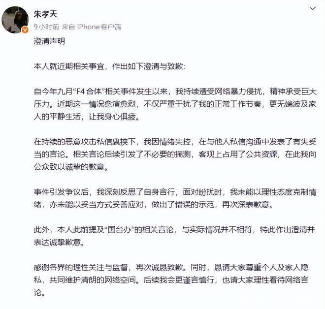 朱孝天公开道歉了。 就在他效仿新晋导师汪小菲,对着F3成员以及曾经的东家发出一系列讽刺言论,并成功让自己登上热搜不小时之后,一份措辞谦逊的道歉声明便匆匆发布。 这一举动的效果就像一场拙劣的烟火秀:点燃引信时声势浩大,但最终炸开的是一团迅速消散、略显尴尬的浓烟。他如愿获得了公众的关注,但随之而来的却是一波又一波的嘲笑。这种迅速、略显慌乱的举动,活脱脱地呈现出一幕没汪小菲的命,却得了汪小菲的病的娱乐圈现状——他理解了黑红也是红的表面逻辑,却没有继承到那份能够将疯狂转化为收益的勇气和策略。